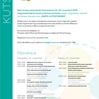Meil on hea meel paluda Teid osalema 22.-23. novembril 2018 Valgamaal Käärikul toimuvale konverentsile sarjast „Kogukonna vedurid“, mis tänavu kannab nime „AASTA UUTES PIIRIDES“.