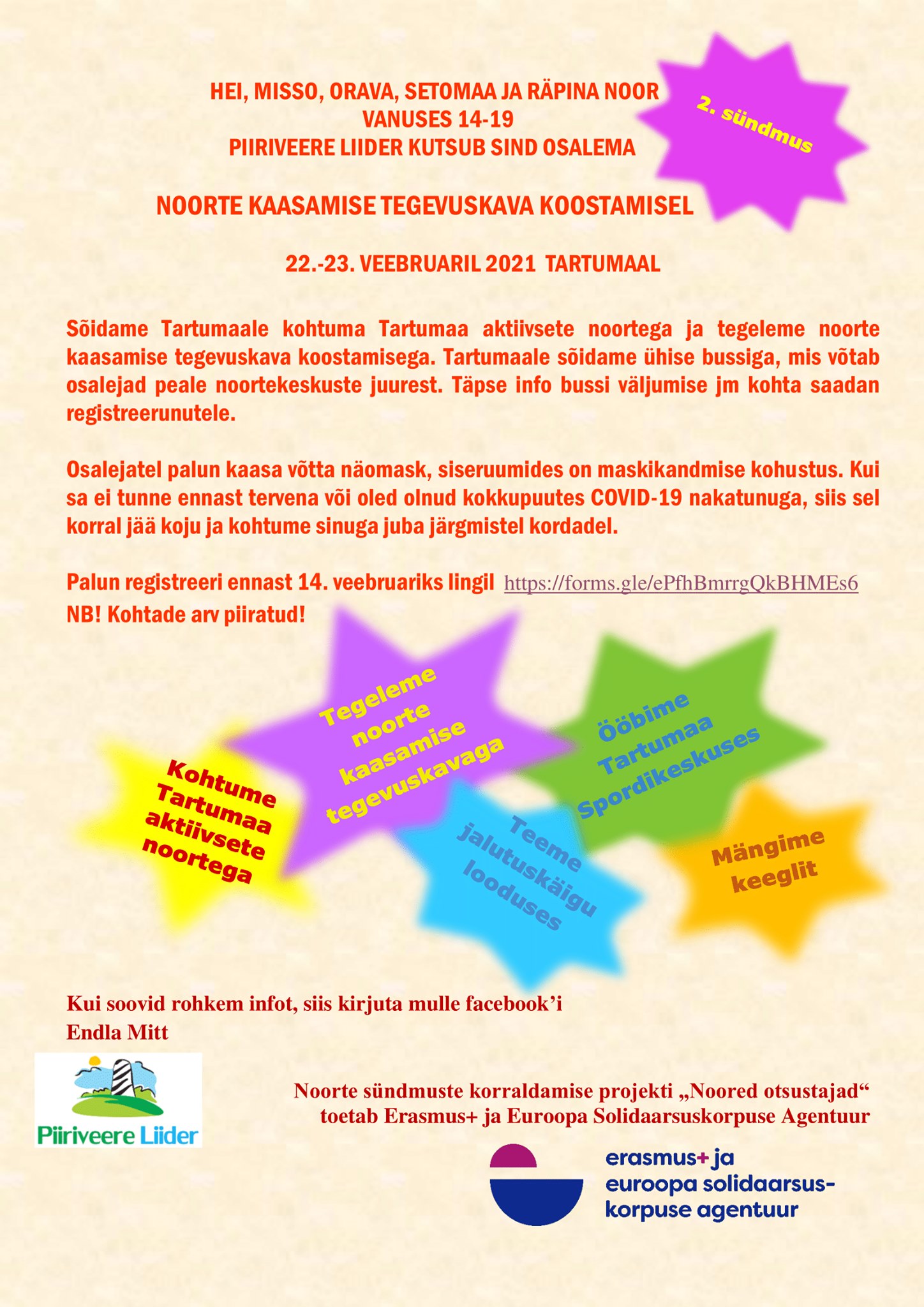 Piiriveere piirkonna noor vanuses 14-19! Meie sündmusele saad ennast registreerida kuni 14. veebruarini lingil https://forms.gle/ePfhBmrrgQkBHMEs6. Osalejatel kaasa maskid!