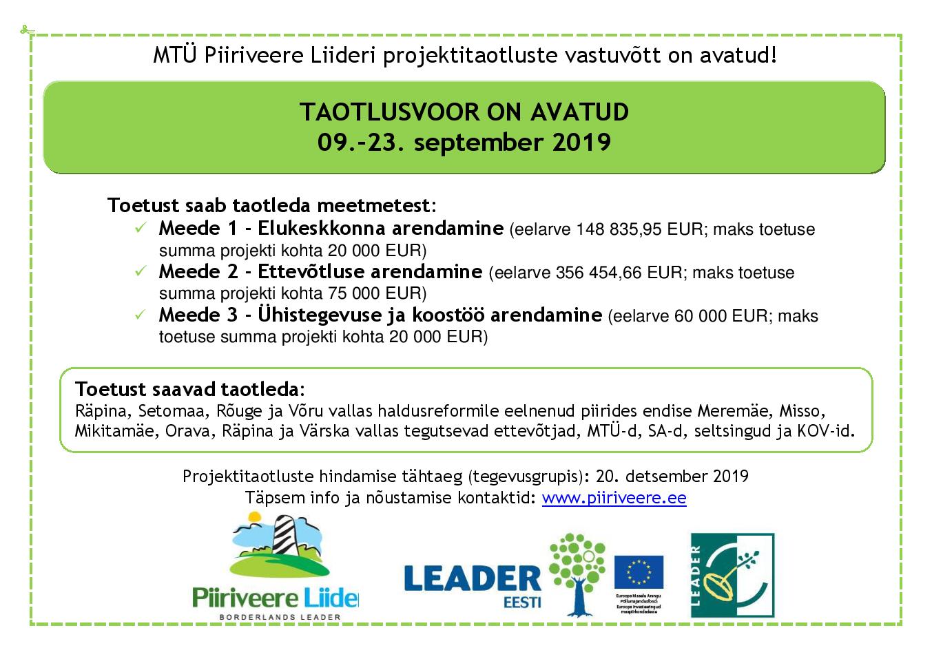Taotlemise kohta jagavad infot Piiriveere Liideri büroo töötajad, võimalik kokku leppida kohtumine Piiriveere Liideri büroos (kuni 19. septembrini).