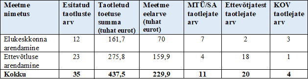 Elukeskkonna arendamise meetmesse esitati kokku 12 investeeringuprojekti, millega kokku küsitakse toetust ligi 161,7 tuhat eurot. Koos taotlejate enda panusega soovitakse piirkonna elukeskkonna arendamisse investeerida üle 233,6 tuhande euro. Meetme eelarve maht on 70 tuhat eurot. Meetmes on maksimaalselt lubatud toetussumma 20 tuhat eurot, keskmine küsitava toetuse suurus on ligi 13,5 tuhat eurot.