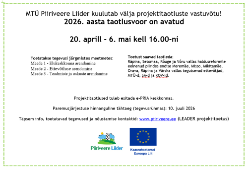 Piiriveere Liidri 2026. aasta LEADER tavameetmete taotlusvoor on avatud 20. aprillist kuni 6. maini. Avatud on strateegia 3 meedet: elukeskkonna arendamine M1, ettevõtluse arendamine M2 ja teadmiste ja oskuste arendamine M3.-