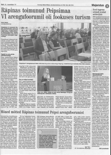 olete oodatud VI Peipsimaa Arengufoorumile „Peipsimaa - hoia hea endale!", mis toimub 16.11.2017 kell 10.30-16.30 Räpina Aianduskoolis (Pargi 32, Räpina).
