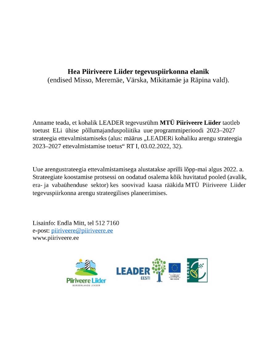 Anname teada, et kohalik LEADER tegevusrühm MTÜ Piiriveere Liider taotleb toetust ELi ühise põllumajanduspoliitika uue programmiperioodi 2023–2027 strateegia ettevalmistamiseks (alus: määrus LEADERi kohaliku arengu strateegia 2023–2027 ettevalmistamise toetus–Riigi Teataja ).